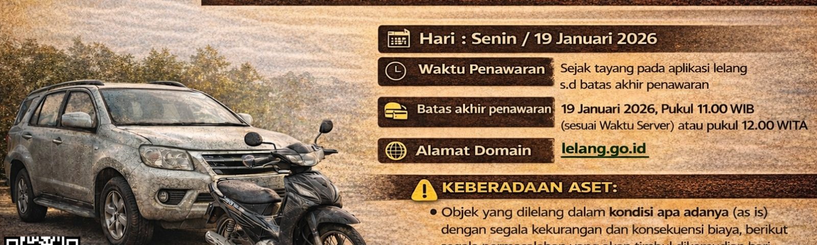 Awal tahun kami bagikan info menarik nih, Ayo ikuti lelang Kendaraan Bermotor Pemerintah Kota Banjarbaru. Lelang telah dibuka hari ini tanggal 13 Januari 2026 dan batas waktu penawaran lelang tanggal 19 Januari 2026 pukul 12.00 Wita